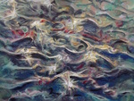 Serie werken waarin het thema water of golven door middel van vereenvoudiging en hand schriftelijke ingrepen tot een abstraherende weergave wordt bewerkt, op deze manier de ruimte gevend aan speelse werkmethodes, maar ook speels associëren.